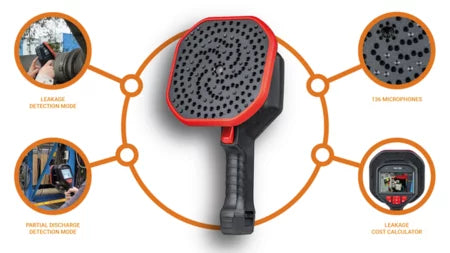 With the help of a built-in microphone array (136 microphones) the imager effectively detects sources of acoustic emission such as leaks of compressed agents in industrial installations or partial discharges in the power utility industry. It is suitable for use in the following areas:
