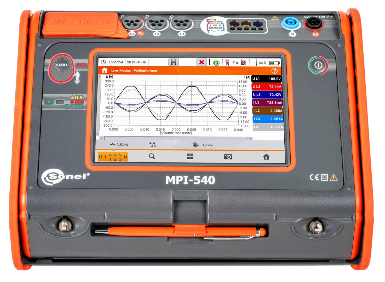 The device is equipped with a color TFT LCD touch screen with a resolution of 800x480 pixels and a diagonal of 7”, which allows for convenient operation and easy reading of parameters and plotted waveforms. This screen size enables displaying more information, available at any time of use. The interface is visible in all conditions – also thanks to the appropriate size of displayed symbols. Included stylus allows to work also with dielectric gloves.