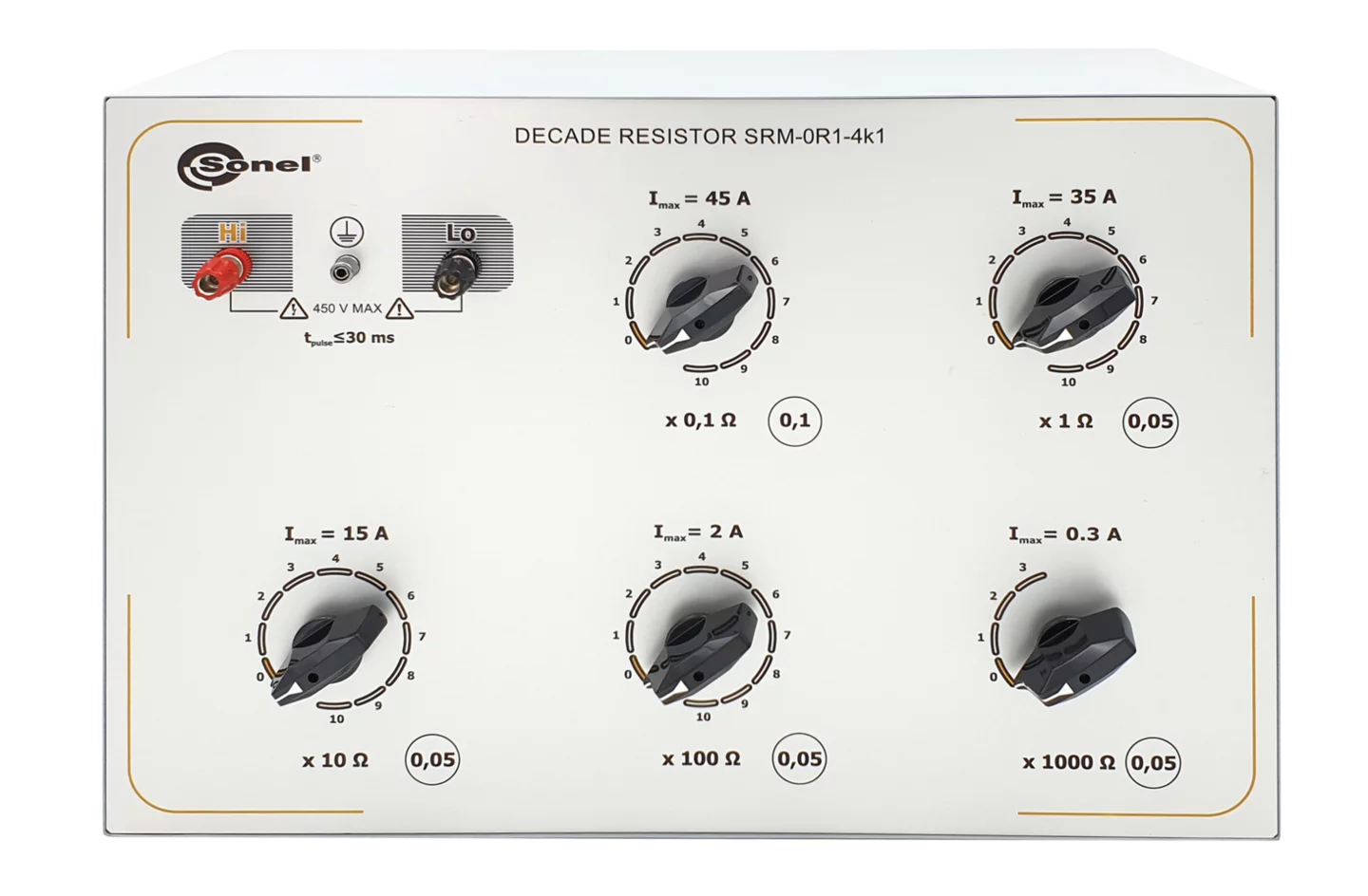 SRM-0R1-4k1 is a high precision decade resistor designed for laboratories and institutions that require highly accurate readings. This device will meet the expectations of the most demanding customers.Built-in resistors provide excellent accuracy and long-term stability. Markings and symbols on the housing of the device clearly inform the user about resistance settings. Measuring connectors allow user to connect the device with a banana plug, spade plug and bare wire terminals.The metal housing efficiently protects the device against mechanical damage. It has rubber feet that stabilize device position on the test bench.Features