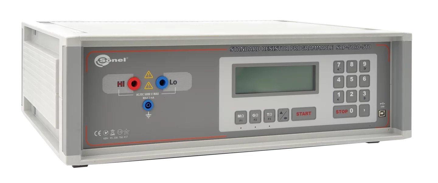 The SRP-50k0-5T0 standard programmable resistor is a source of high resistances used as standard equipment for calibration and testing of analog and digital insulation resistance meters.